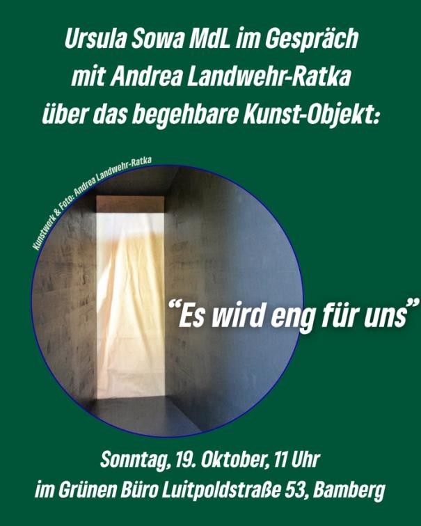 Liebe politisch und künstlerisch Interessierte! Ich lade Sie herzlich zur Vernissage in meinem Abgeordnetenbüro (Luitpoldstr. 53, Bamberg) am 19. Oktober 2025 um 11 Uhr ein. Für drei Wochen soll dort das Kunstwerk „Zeitenwende – Es wird eng für uns“ von Andrea Landwehr-Ratka unsere Gedanken anregen.